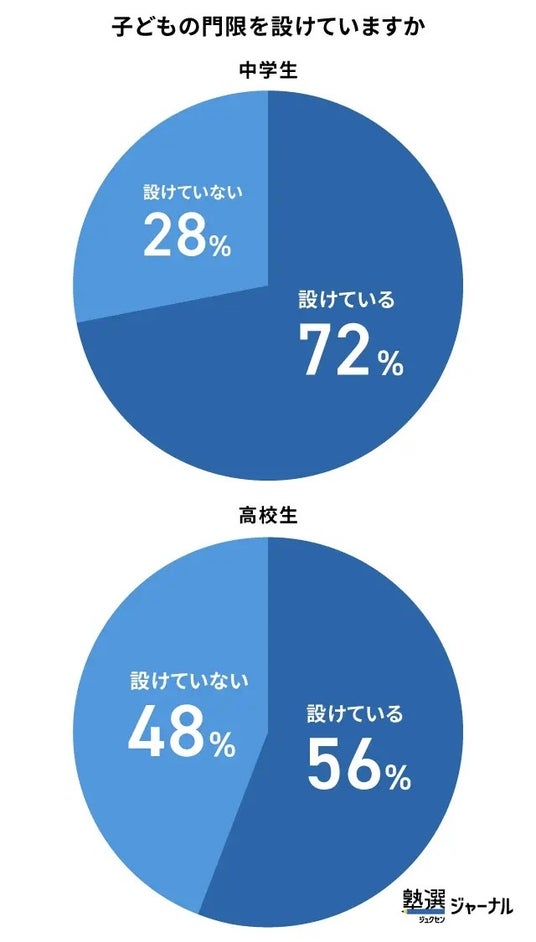 まず門限については、中学生の家庭では72%が設けていました。一方、高校生では56%と、中学生と比べて門限の設定率が約15%低くなります。