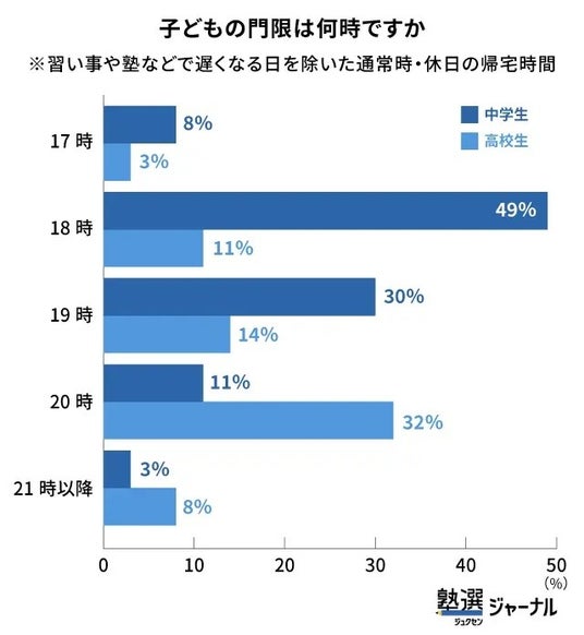 中学生の門限は18~19時が多く、部活動があっても、夜遅くならない時間帯で帰宅することが前提となっているようです。一方、高校生で門限を設けている場合は20時が最多でした。
