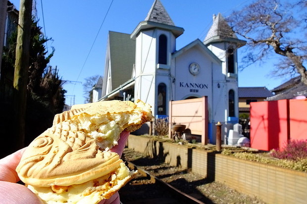 この観音駅にある売店では、お好み焼きの具をたい焼きの皮で包んで焼いた「金目焼き」(180円)が人気。コトコトと走る銚子電鉄を見ながら、“銚電ローカルフード”を試す。