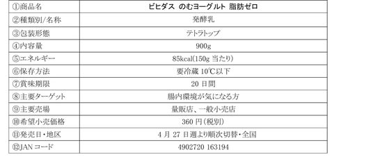 「ビヒダス のむヨーグルト 脂肪ゼロ」は、酸味を抑えた、乳のまろやかな味わいが特長の大容量(900g)のむヨーグルトです。脂質を気にしている方も毎日続けやすい脂肪ゼロタイプです。この度、生きて大腸まで届き、腸内環境を整える機能が報告されている『ビフィズス菌 BB536』を機能性関与成分とした機能性表示食品としてリニューアル発売いたします。味わいはそのままに、おなかの健康価値を強化することで、お客さまのニーズにより一層応えてまいります。「ビヒダス のむヨーグルト 脂肪ゼロ」をお召しあがりいただき、腸のケアにお役立てください。