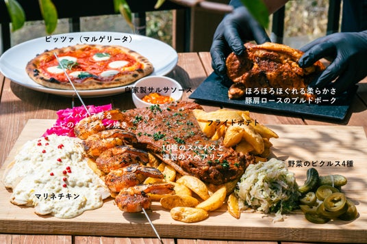 Low&Slow製法で仕上げた3種のお肉を最後まで美味しく召し上がっていただけるよう野菜のマリネ4種、自家製サルサソースを添えました。ピッツァ&フライドポテト、エビのケイジャン焼きを盛り込みワンプレートに仕上げました。