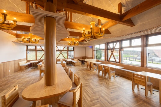 レストランエリアでは大山乳業の牛乳や乳製品を使った料理、スイーツ、鳥取県産牛肉の料理が充実しています。レストランのテーブル天板とイスで使用する材料は、鳥取県産の木材です。