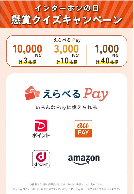 ※「えらべるPay (R)」は、株式会社ギフティが提供するデジタルギフトであり様々なスマホ決済サ-ビスポイントの中から贈呈された「ギフトボイント」内でお好きな商品と交換することができます。「えらべるpay(R)」および「ギフトボイント」の利用には会員登録やアプリダウンロードの必要もなく、保有ポイント内で複数の決済サービスポイントを選ぶことも可能です。 PayPayポイントは出金、譲渡不可です。PayPay/PayPayカード公式ストアでも利用可能です。 「au PAY」は、KDDI株式会社の商標です。本キャンペーンは【一般社団法人 インターホン工業会】による提供です。 本キャンペーンについてのお問い合わせは Amazon ではお受けしておりません。インターホンの日キャンペーン係【kinen-bi@jiia.gr.jp】までお願いいたします。Amazon、Amazon.co.jp およびそれらのロゴは Amazon.com, Inc.またはその関連会社の商標です。