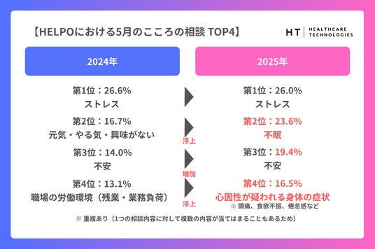 2024年5月は「やる気が出ない」など心理的な不調が上位だった一方、2025年5月は「不眠」や「身体の不調」が上位に入り、自律神経の乱れを示唆する症状が目立つ結果となりました。