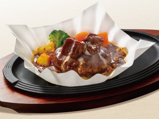 ビーフシチューハンバーグ 1,830円(税込2,013円) クラシックテイストの合挽ハンバーグとロイヤル伝統のビーフシチューをご一緒に。鉄板に紙鍋をのせてご提供することで最後まであつあつの状態でお楽しみいただけます。