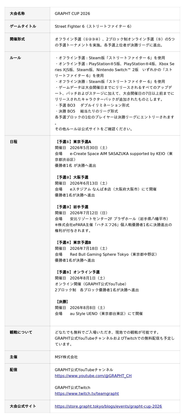 この度、『GRAPHT』主催による対戦格闘ゲーム「ストリートファイター6」のオープン大会「GRAPHT CUP 2026」(以下、本大会)を開催いたします。