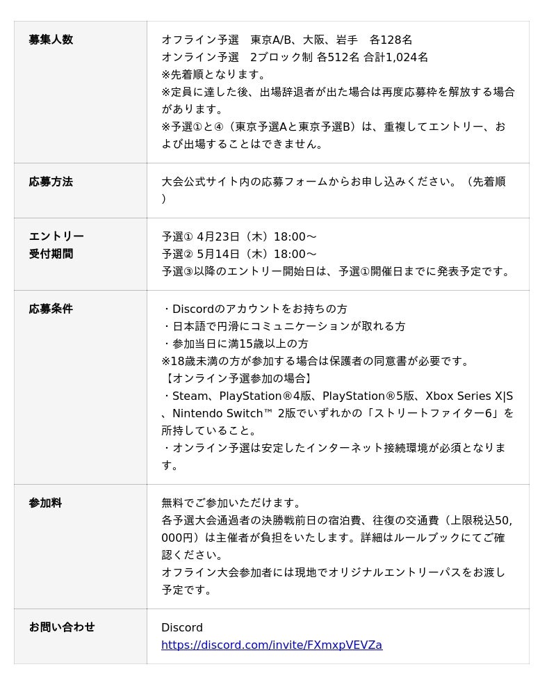 本大会は、東京・大阪・岩手でのオフライン予選と、オンライン予選を組み合わせることで、より多くの格闘ゲーマーが参加しやすい仕組みを実現しました。会場ならではの熱気や、プレイヤー同士が直接顔を合わせて競い合い、交流できるオフライン大会の魅力を大切にしながら、地域やスケジュールの都合で現地参加が難しい方にも、オンライン予選を通じて挑戦の機会を提供します。■予選を勝ち抜いた選手は、決勝会場までご招待