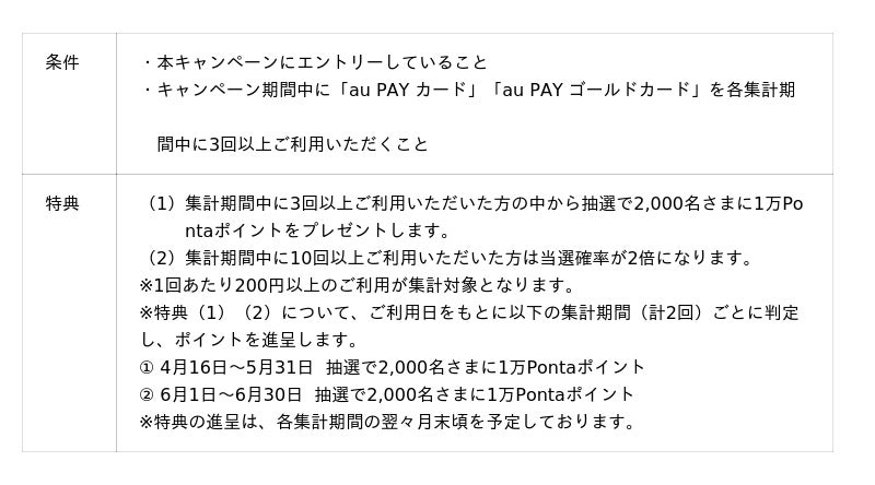 auフィナンシャルサービス株式会社(本社:東京都港区、代表取締役社長:長野 敦史、以下、当社)は、2026年4月16日から2026年6月30日までの間、エントリーのうえ、「au PAY カード」「au PAY ゴールドカード」を3回以上ご利用いただいた方の中から抽選で2,000名さまに1万Pontaポイントをプレゼントする「1万Pontaポイントが当たる!春の大感謝祭!」を開催します。さらに、集計期間中に10回以上ご利用いただいた方は当選確率が2倍になります。