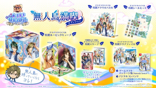 豪華版の「ドキドキサバイバル 無人島満喫エディション」を購入すると、特製の「アクリルパネル」や切手風デザインの「シールセット」など豪華特典がついてきます。メインビジュアルの王子様たちがデザインされた「ルービックキューブ」は、ミニキャラがデザインされたステッカーやスタンプで彩られた配送ボックス風の箱に入れてお届けする予定です。