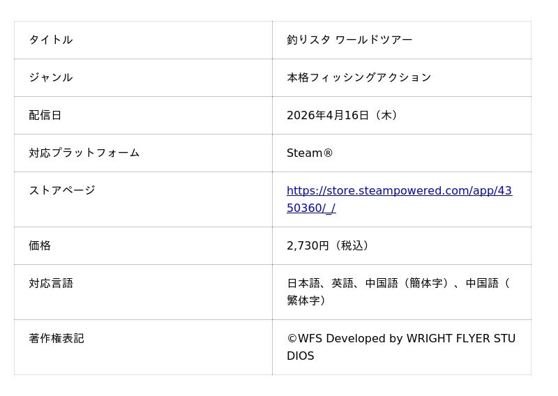 株式会社WFS(本社:東京都港区、代表取締役社長:柳原 陽太、グリーホールディングス100%子会社、以下「当社」)は、2019年のリリース以来、世界累計出荷・販売本数が20万本(※1)を突破し、日本、中国、欧米など37カ国で人気を集めるフィッシングアクションゲーム『釣りスタ ワールドツアー』を、本日2026年4月16日(木)よりSteam(R)︎向けに配信開始しました。