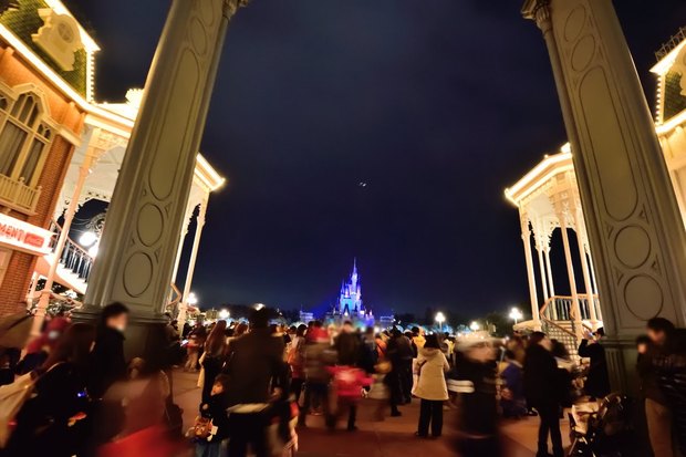 ワールドバザールの出口付近もまだまだ余裕があり、ポイントとなるシンデレラ城の “時計より下” が見えます。