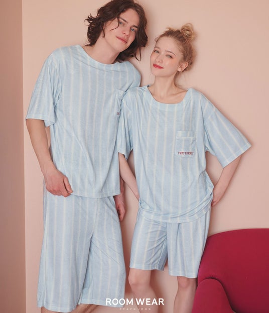 とろみのある柔らかなパイル生地は、ストレッチが効くラクな着心地で、触れるとひんやり、さわやかな快適素材。チェリー柄や爽やかなストライプ柄をそろえ、ストライプはメンズサイズも展開。おそろいコーデはもちろん、ギフトとしてもおすすめです。