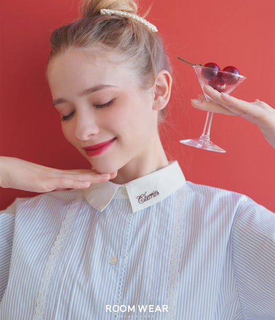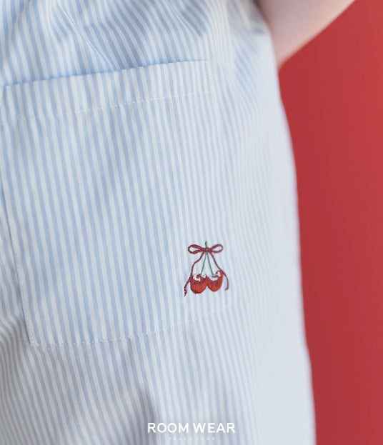 遊び心のあるチェリープリントと、爽やかなストライプが目を引く、夏らしい軽やかなパジャマは、ベーシックなシャツデザインに、刺しゅうやレースなどをたっぷり盛り込んで、細部までガーリー。左襟に「Cherries」、ヒップ右側に、チェリーのワンポイント刺しゅう入り。綿混素材を使用し、薄手ながら適度なにハリがあり、軽やかな着心地です。