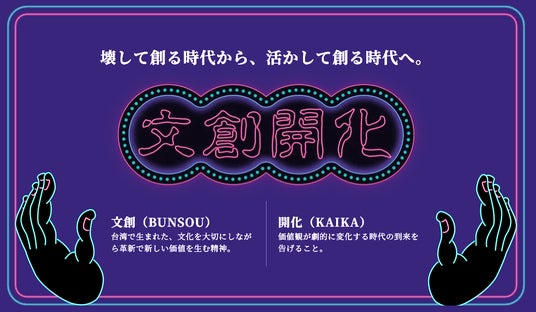 「文創」とは、文化や歴史を大切にしながら、デザインやイノベーションの力を使って新たな価値を生み出すという考え方で、台湾で広く使われてきました。ここに「文明開化(西洋の文化や技術が急速に社会へ入り込み、人々の生活や価値観が大きく変化した時代を象徴する言葉)」を掛け合わせて、文創という考え方で新しい時代が幕開けていくことを表現しました。