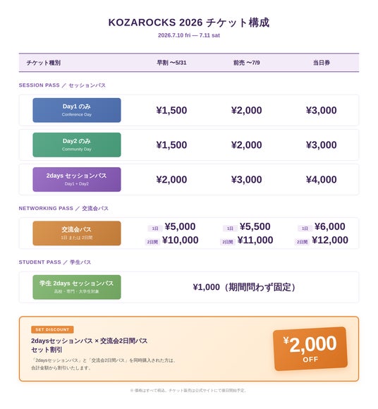 KOZAROCKS 2026では、目的に合わせて選べる複数のチケットプランをご用意しています。早割・前売・当日券の3段階価格で販売します。