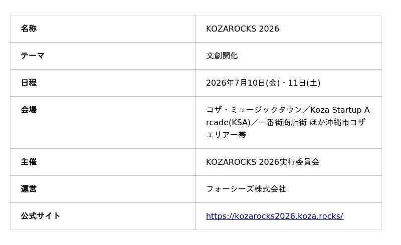 沖縄・コザを拠点にスタートアップ支援を行うフォーシーズ株式会社(本社:沖縄県沖縄市、代表取締役:豊里健一郎)が運営元となるKOZAROCKS実行委員会は、沖縄発のスタートアップカンファレンス&フェスティバル「KOZAROCKS 2026」を、2026年7月10日(金)・11日(土)の2日間、沖縄市コザにて開催いたします。6回目の開催となる本年のテーマは「文創開化(ぶんそうかいか)」。過去最大となる延べ8,000名超の来場を見込み、スタートアップ・投資家・事業会社が沖縄を舞台にクロスボーダーな共創機会を生み出します。