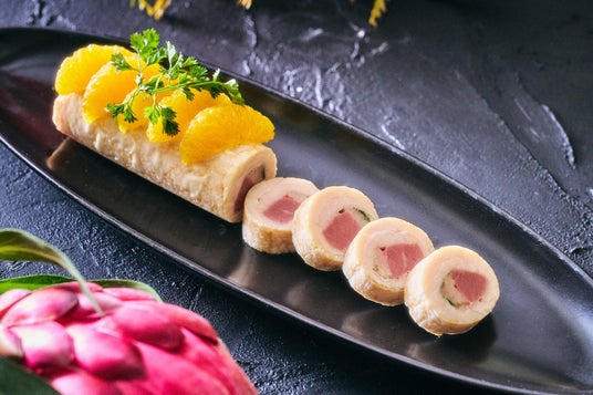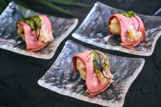 低温調理でやわらかく仕上げたスモークタンでマッシュポテトを包み、葱しょうがを添えて
