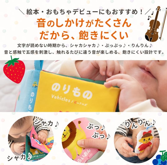 赤ちゃんへの読み聞かせでは、「なかなか興味を示してくれない」「どう読めばいいかわからない」と感じることも少なくありません。やさしい布えほんでは、オノマトペや英語などを取り入れることで、親子で楽しみながら読み聞かせができるよう工夫しています。また、赤ちゃんが見やすいよう、コントラストのはっきりした色や形を採用しています。