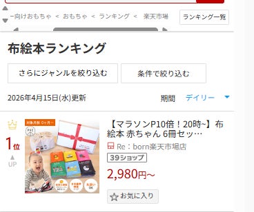 Co-Goodsのやさしい布絵本は、楽天デイリーランキング布絵本部門で1位(4月15日)を獲得し、赤ちゃんを持つパパ・ママから圧倒的な支持をいただいております。