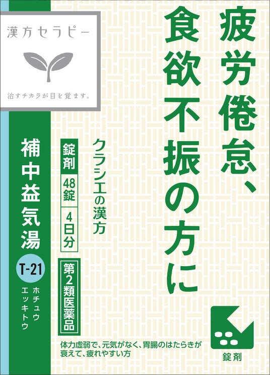「補中益気湯」は、身体のエネルギーである「気(き)」の量が不足した「気虚(ききょ)」体質の方におすすめの漢方薬です。「気虚」になると、常にエネルギー不足の状態になるため、疲れを感じやすくなります。「補中益気湯」は胃腸を元気にすることで、飲食物の消化吸収機能を高めて、「気」の生成を促し、疲労倦怠を改善します。