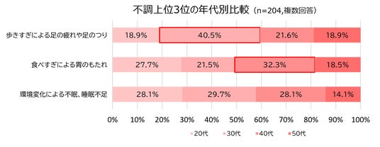 さらに、上位3つの不調を年代別で比較したところ、「歩きすぎによる足の疲れや足のつり」は30代が最も多く、40.5%を占めています。また、「食べすぎによる胃のもたれ」では40代が最も多く、32.3%が悩んでいることが分かりました。このことから、30代は観光、40代は食といったように、年代によって感じやすい不調が異なる傾向が見られます。一方で、「環境変化による不眠、睡眠不足」では、20~40代で大きな差は見られず、世代の違いに関わらず悩みが発生しやすいことが分かりました。