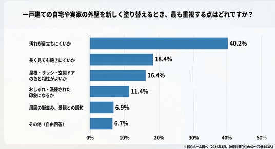 - 外壁カラー選びで最重視は「汚れが目立ちにくいか」40.2%、「おしゃれ・洗練」は11.4%で4位