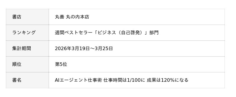 株式会社Uravation(本社:東京都文京区、代表取締役:佐藤 傑)の代表 佐藤 傑の著書『AIエージェント仕事術 仕事時間は1/100に 成果は120%になる』(SBクリエイティブ、2026年2月27日発売)が、丸善 丸の内本店の週間ベストセラー「ビジネス(自己啓発)」部門(集計期間:2026年3月19日~3月25日)で第5位にランクインいたしました。