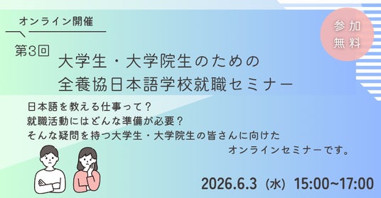 一般社団法人全国日本語教師養成協議会(全養協)は、2026年6月3日(水)に「第3回大学生・大学院生のための全養協日本語学校就職セミナー」をオンラインにて開催いたします。