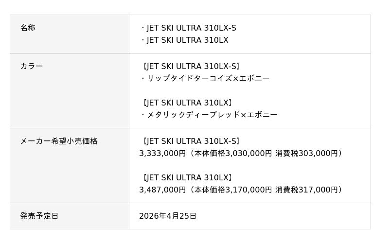 株式会社カワサキモータースジャパン(本社:兵庫県明石市、代表取締役社長:佐伯 健児)は、「JET SKI ULTRA 310LX」「JET SKI ULTRA 310LX-S」を2026年4月25日(土)に発売いたします。