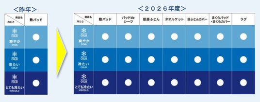 こうしたなか今年は、“シリーズ最冷”の冷たさを誇る「アイスコールド」シリーズの商品数は前年の約1.4倍に強化します。「同じ冷たさですべての寝具を揃えたい」「アイスコールドで揃えて節電しながら涼しく寝たい」というお客さまの声にお応えし、3段階の冷たさから選べる商品を、昨年の1種類(敷パッド)から、肌掛ふとん・まくらパッドなど7種類に拡充します。