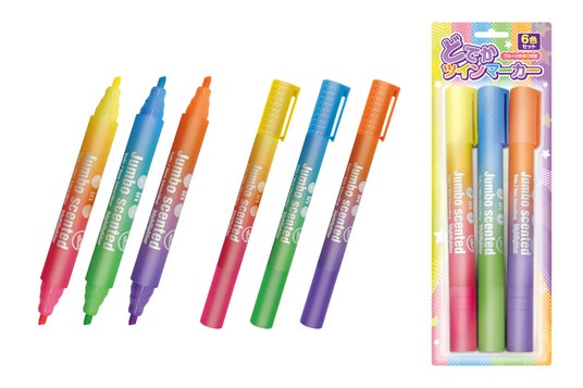 特徴:全長24.5cmのどでかツインマーカー!どでかサイズで、存在感バツグンです。1本で2色使え、さらに楽しい香り付きインク採用でほんのり香ります。ポスター、POP、イラスト、学校の工作などにぴったりです。