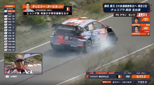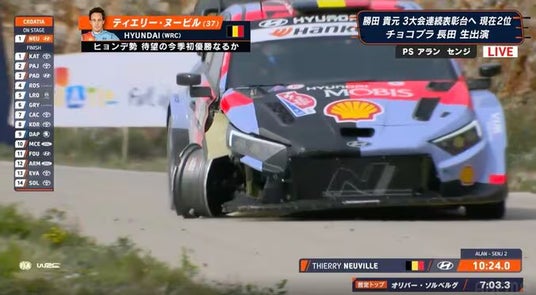 スタジオの熱気そのままに迎えた『クロアチア・ラリー』本戦の最終日(デイ3)では、誰もが予想しなかった劇的な結末が待っていました。最終ステージ(SS20)を迎えた時点では、ティエリー・ヌービル選手(ヒョンデ)が後続の勝田選手に対して1分15秒もの大差をつけて首位を独走しており、普通に走れば追い抜くことは困難な盤石の状況でした。しかし、最終走者のヌービル選手の走行が始まると、中盤の計測地点でトップから1分19秒も遅れるという明らかな異変が発生します。ヌービル選手は、右コーナーの先でコース左側にあった側道へ車体を落とし、そのまま側道へ進入。さらに分岐にあったコンクリートブロックに直撃するまさかのアクシデントに見舞われていたのです。放送席の誰もが信じられない様子で「ミスコース?」「コースアウト?」とざわつき、実況の布施宏倖アナウンサーも思わず「何が起きたんだ」とつぶやきます。解説の山本氏も「何に当たった今?」と状況が判然としないほどの大波乱でした。非常に狭い側道で何度も切り返してコースに復帰したヌービル選手でしたが、右フロントタイヤが外れかけるほどの甚大なダメージを負い失速。チームからのリタイア指示にもかかわらず最後まで力を尽くしたものの、首位陥落という無念の結果となりました。