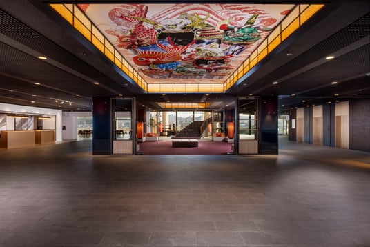 勇壮な唐津くんちをモチーフとしたロビーの天井。旅気分も盛り上がる