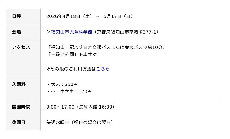1階イベント広場にて、第23回コンテストの優秀作品30点を展示します。世界中の子どもたちが自然や生きものをしっかりと見つめ、真剣な思いを込めて描いた作品は、どれも魅力あふれるものばかりです。また、国や地域、年齢、表現方法など、作品一つひとつに個性が光ります。会場となる福知山市児童科学館(京都府福知山市)は、三段池公園内にあり、子どもたちが科学について楽しみながら学び、体験できる施設です。館内には、さまざまな展示や体験コーナーのほか、満点の星空や迫力ある全天周映像が楽しめるプラネタリウムも備えています。科学について体験しながら学ぶとともに、メッセージや思いが込められた、すばらしい作品の数々をこの機会にぜひご覧ください。ご来場をお待ちしています。