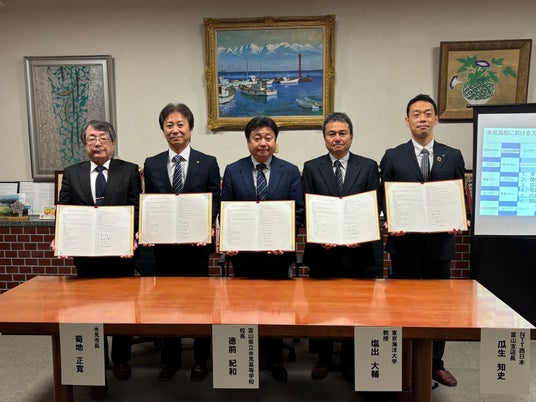 富山県立氷見高等学校(以下、氷見高校)、氷見市、国立大学法人東京海洋大学学術研究院海洋生物資源学部門塩出大輔教授(以下、東京海洋大学)、能越ケーブルネット株式会社、NTT西日本株式会社富山支店(以下、NTT西日本)の5者は、氷見高校海洋科学科の教育充実および地域の海洋産業の高度化を目的として、氷見高校におけるスマート海洋探究学習の推進に関する連携協定(以下、本協定)を2026年4月16日に締結しました。