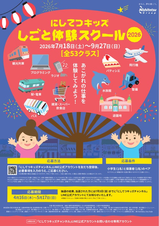 西鉄グループでは、2026年7月18日(土)から9月27日(日)までの期間中、当社グループの多種多様な仕事をお子さまに体験していただけるプログラム「にしてつキッズしごと体験スクール2026」を開催いたします。