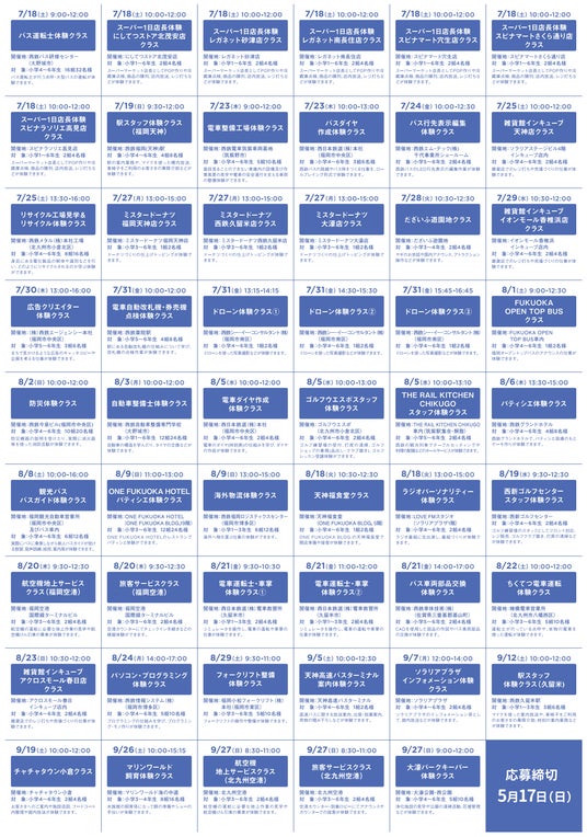 そのほか、毎年好評をいただいております「マリンワールド飼育体験クラス」、「電車運転士体験クラス」、「パティシエ体験クラス(西鉄グランドホテル)」、「バス運転士体験クラス」など合計53クラスを開設いたします。定員につきましても、昨年より10組増の計181組に拡大します。