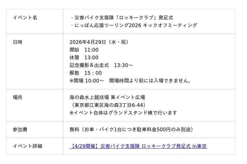 2026年4月29日(水・祝)東京・海の森水上競技場で災害バイク支援隊「ロッキークラブ」発足式、ならびに「にっぽん応援ツーリング2026」の開幕を祝うキックオフミーティングを開催します。参加費無料。