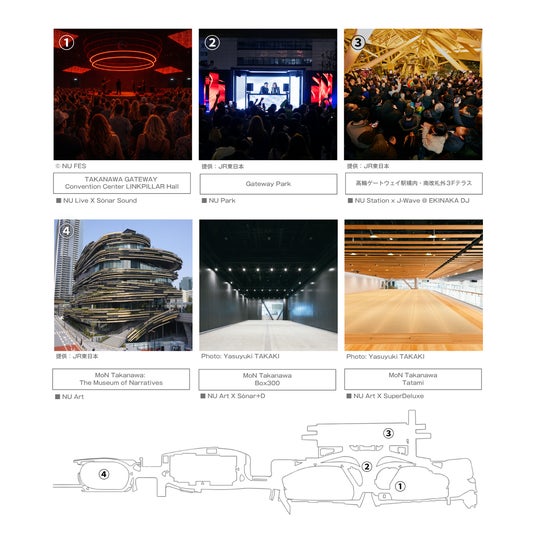 「高輪ゲートウェイ駅構内・南改札外3Fテラス」ではJ-WAVEとコラボレーションによる「NU Station」、高輪ゲートウェイ駅前に広がる「Gateway Park」では「NU Park」を実施するなど、4つのコンセプトで構成される都市回遊型のフェスティバルとして多層的な体験を提供します。