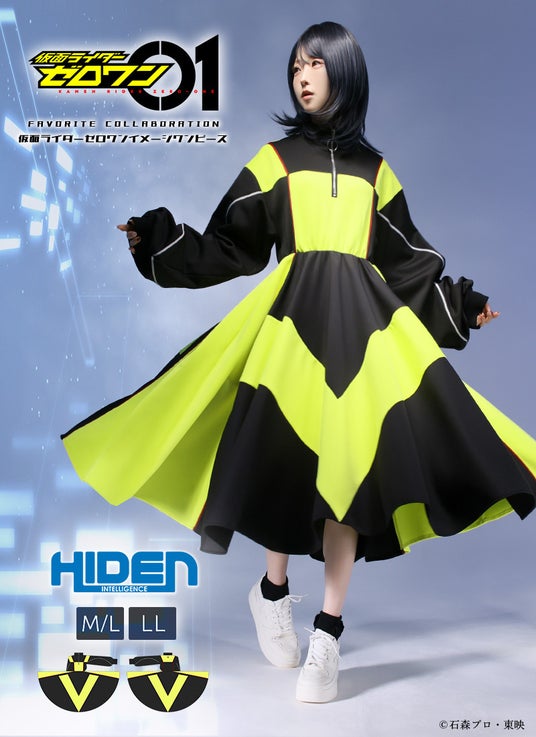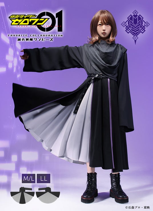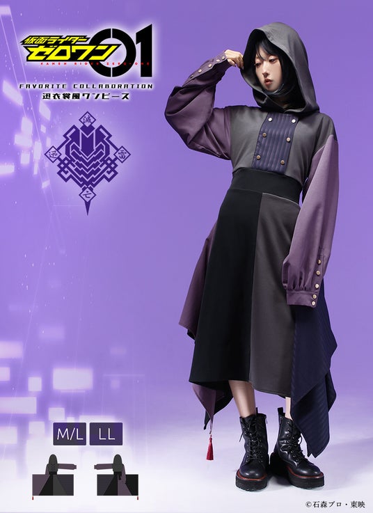 仮面ライダーゼロワン ライジングホッパーをイメージしたジャージ素材のワンピース。カジュアルな印象もありながら、生地を贅沢に使用した全円スカートシルエット。背面には「01」のロゴをプリント。ウエストゴム仕様でゆったり着用可能。