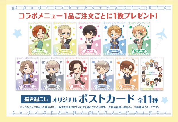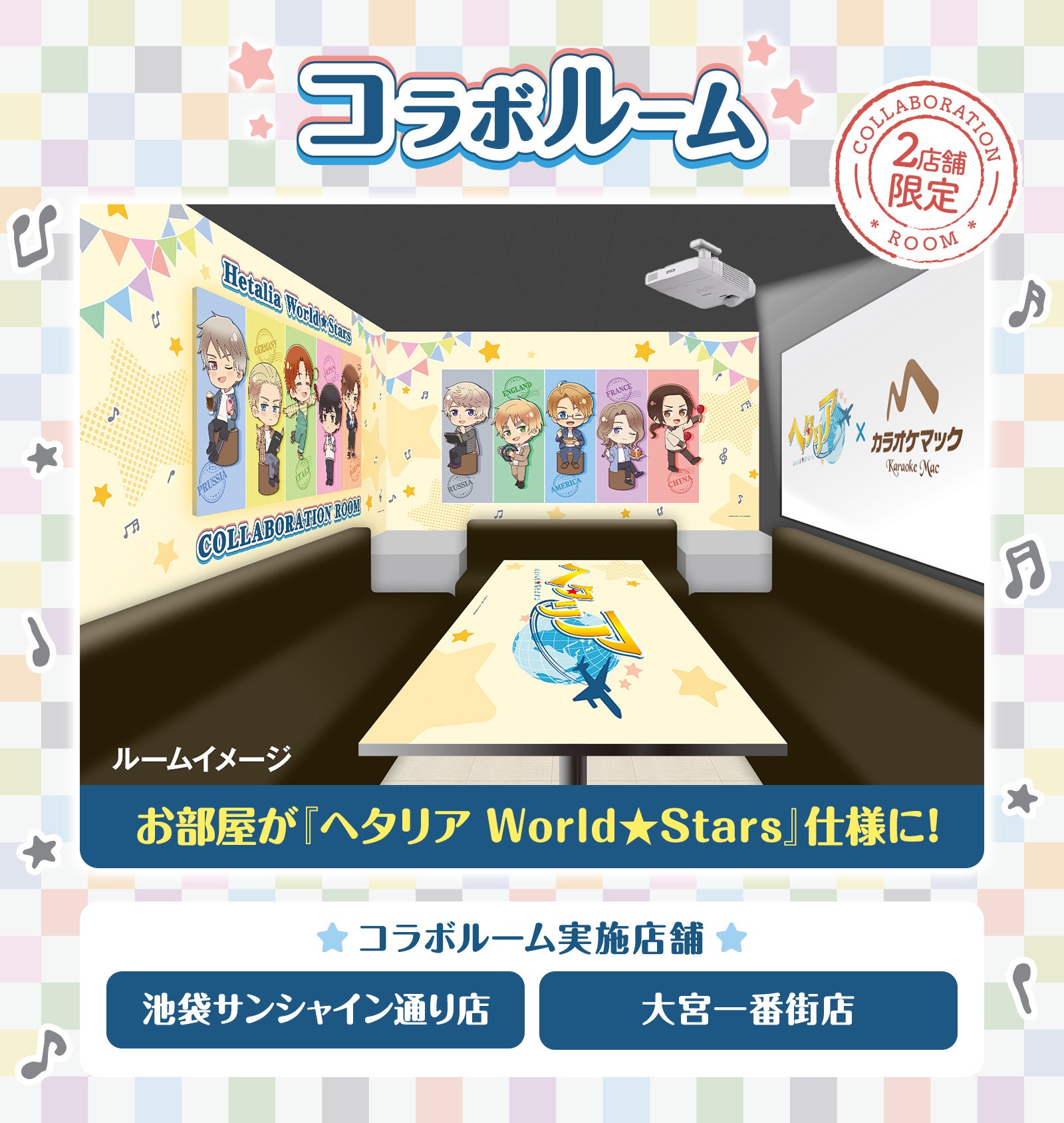カラオケを楽しむ姿を描いたミニキャライラストを使用したコラボ限定グッズの販売をはじめ、コラボメニューの提供やコラボルームの展開など、『ヘタリア World★Stars』の世界観を存分にお楽しみいただけるコラボキャンペーンになっております。