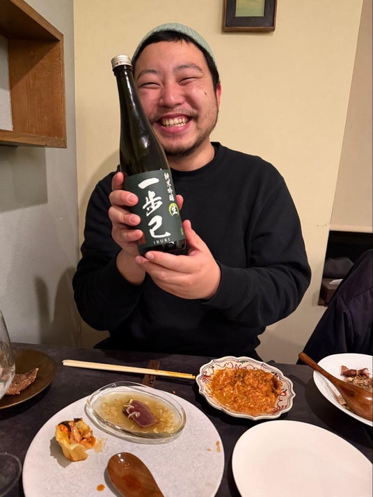 豊国酒造の「一歩己」を一緒に飲み交わす様子