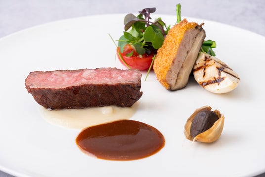 秋田牛ロース肉のロティ そのジュと黒にんにく ファルスを詰めた原木椎茸のフリットと秋田産野菜を添えて