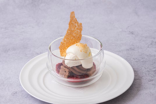 ・デザート 秋田を感じるフォレ ノワール サキホコレのクレームとグラスを添えて