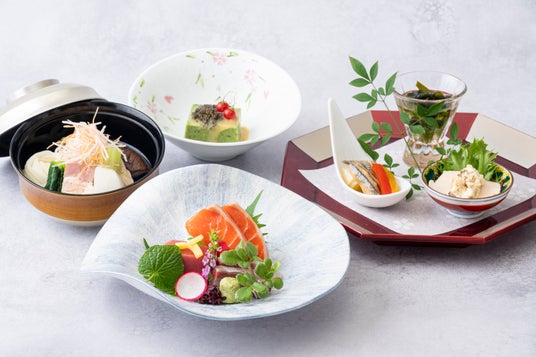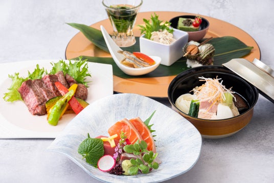 ホテル最上階にある日本料理「旬彩」では、秋田の初夏の恵みを取り入れ、多彩な味わいとともに季節の移ろいを感じていただける夜の会席料理をご用意いたします。