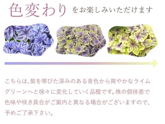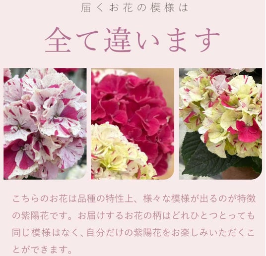 アジサイは育てる過程で花色の変化を楽しめる点も魅力のひとつです。今回のラインナップでも、色の移り変わりを楽しめる品種を取り入れ、長く楽しめる花ギフトとして提案しています。