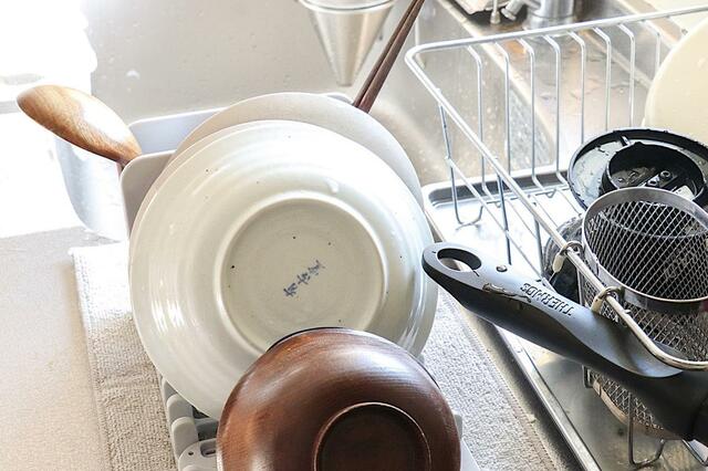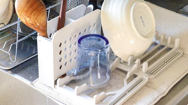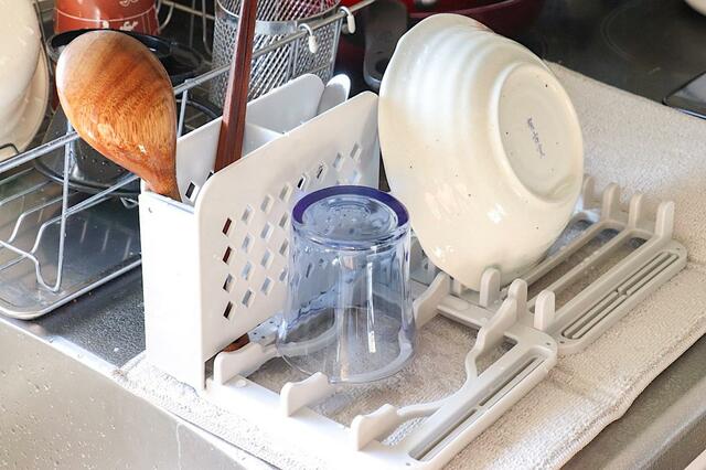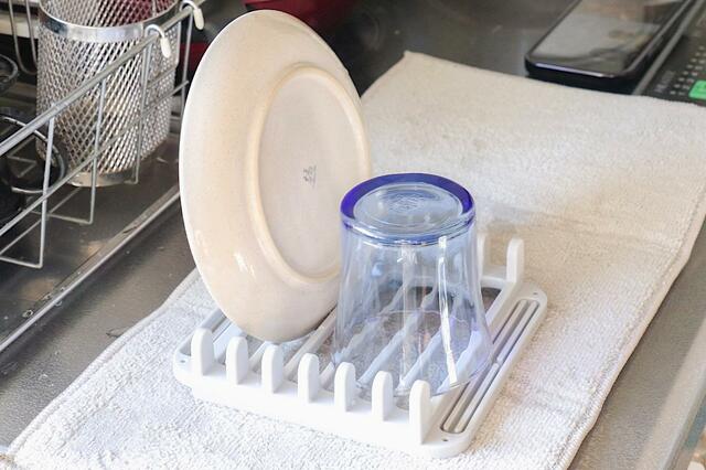 平たい皿だけでなく、ボウルや汁椀、カトラリーなども置けるので、「いつもの水切りラックだけだと足りない」という場面でも助かりました。