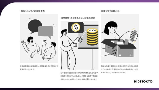通常のハイブランド購入では「ブランド本社(欧州)→ 日本法人 → 百貨店 → 消費者」と複数の中間コストが上乗せされます。HIDE TOKYOは欧州ブティックと直接取引することで、このコストをすべてカットしています。さらに「店舗を持たない」EC専業モデルにより、都心一等地の家賃・接客スタッフの人件費・大規模広告費といった固定コストも発生しません。削減したコストはすべてそのまま価格に還元されます。