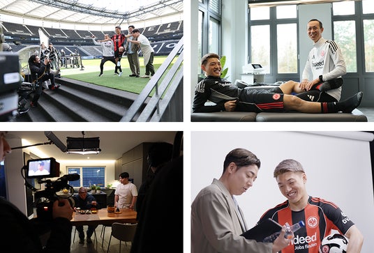本CMは、ドイツ・フランクフルトにあるアイントラハト・フランクフルトのトレーニング施設にて撮影を実施。普段から練習を行っているリアルな環境の中、日本語・ドイツ語・英語が飛び交う国際色豊かな撮影となりました。すべての撮影を終えると、「チャオチャオ!」と声を掛け合いながら笑顔で締めくくり、最後まで和やかでチームワークの良さが感じられる撮影現場となりました。