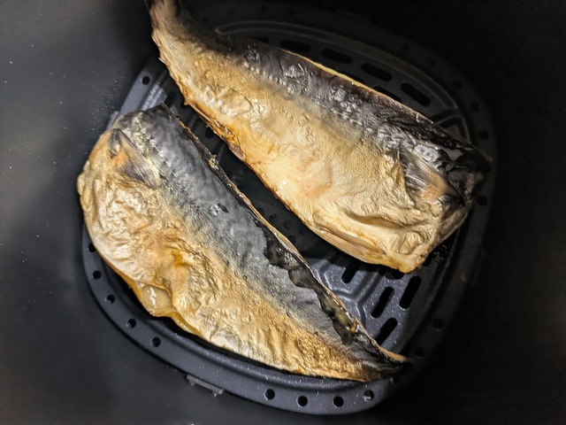 一方で、朝食に試した冷凍サバ(解凍済み)の結果はイマイチでした。加熱中から生臭さを感じ、仕上がりもパサッとした見た目に…。